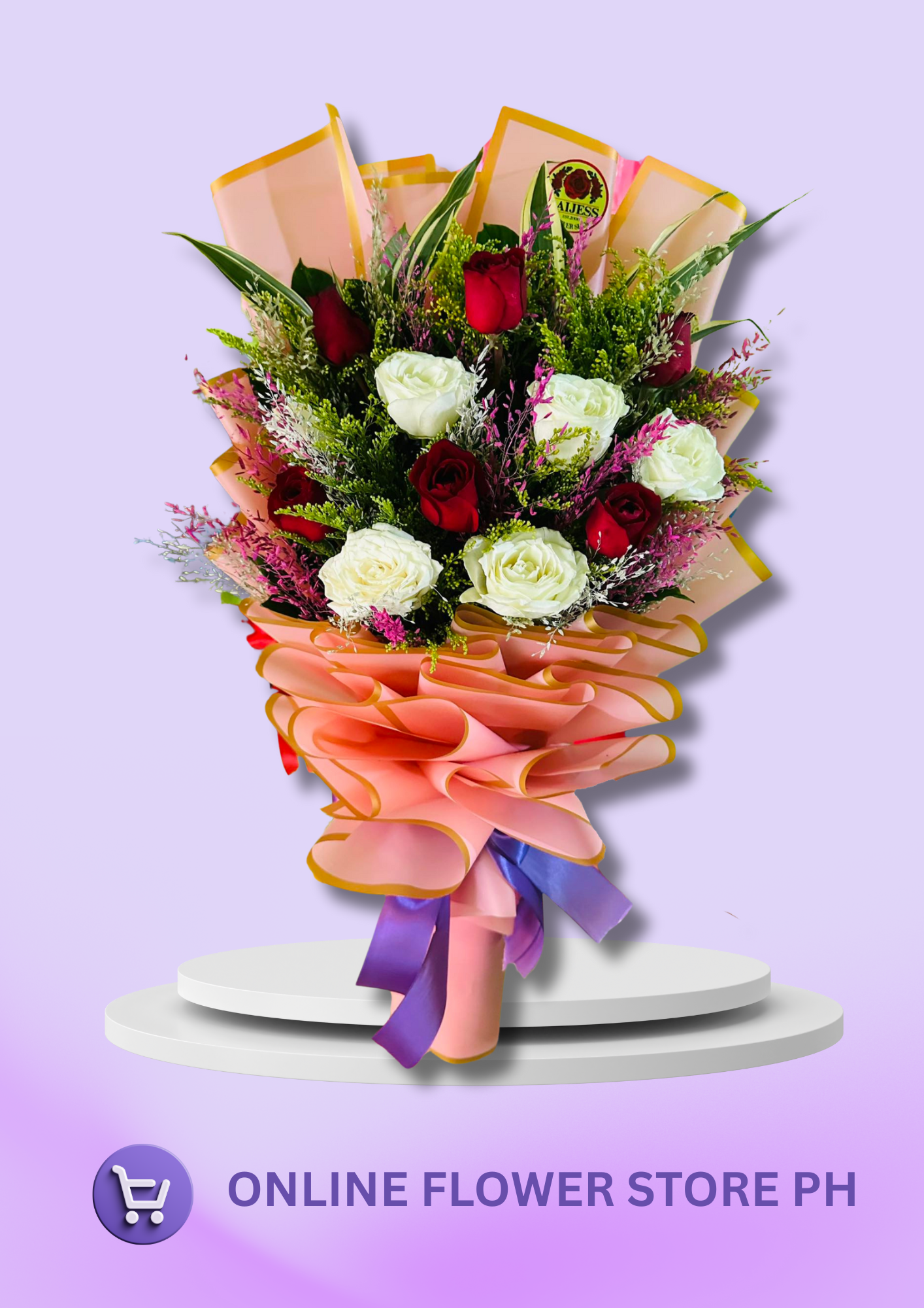 A lovely blend of six red and six white roses, beautifully wrapped in soft pink. This bouquet symbolizes passion, purity, and tenderness — the perfect gift to express love in its most graceful form.