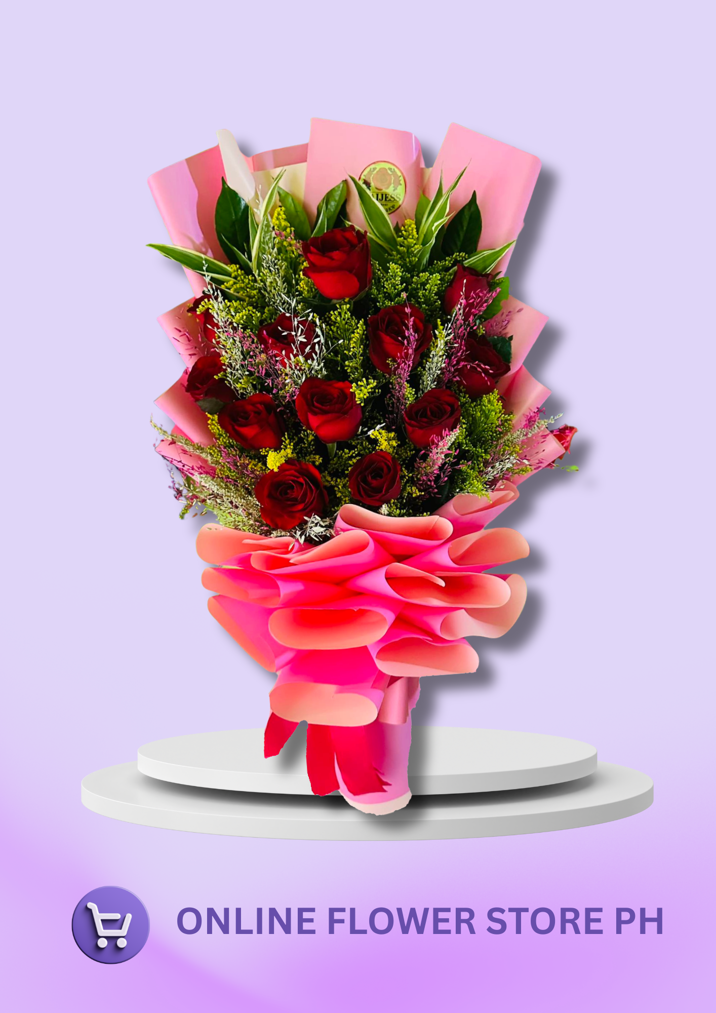 12 red roses in a bright pink wrapper — a bold, romantic bouquet that says “I love you” with confidence and charm.