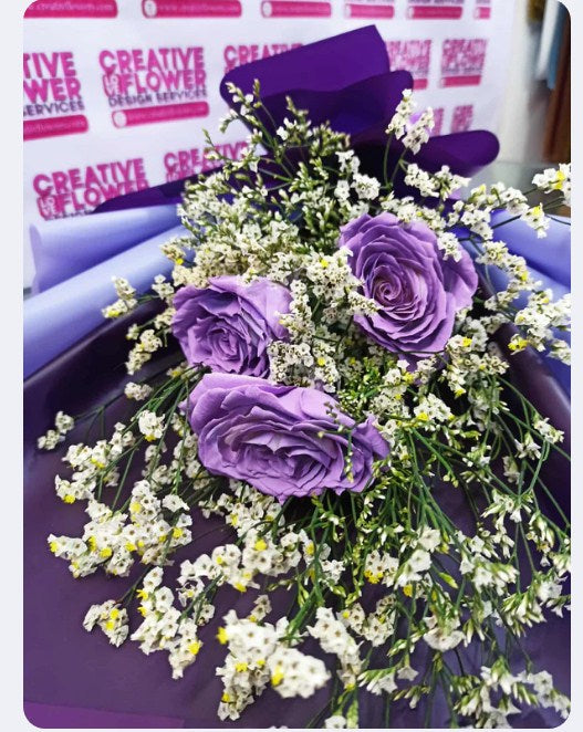 3 stems of purple spray roses in a purple wrapper