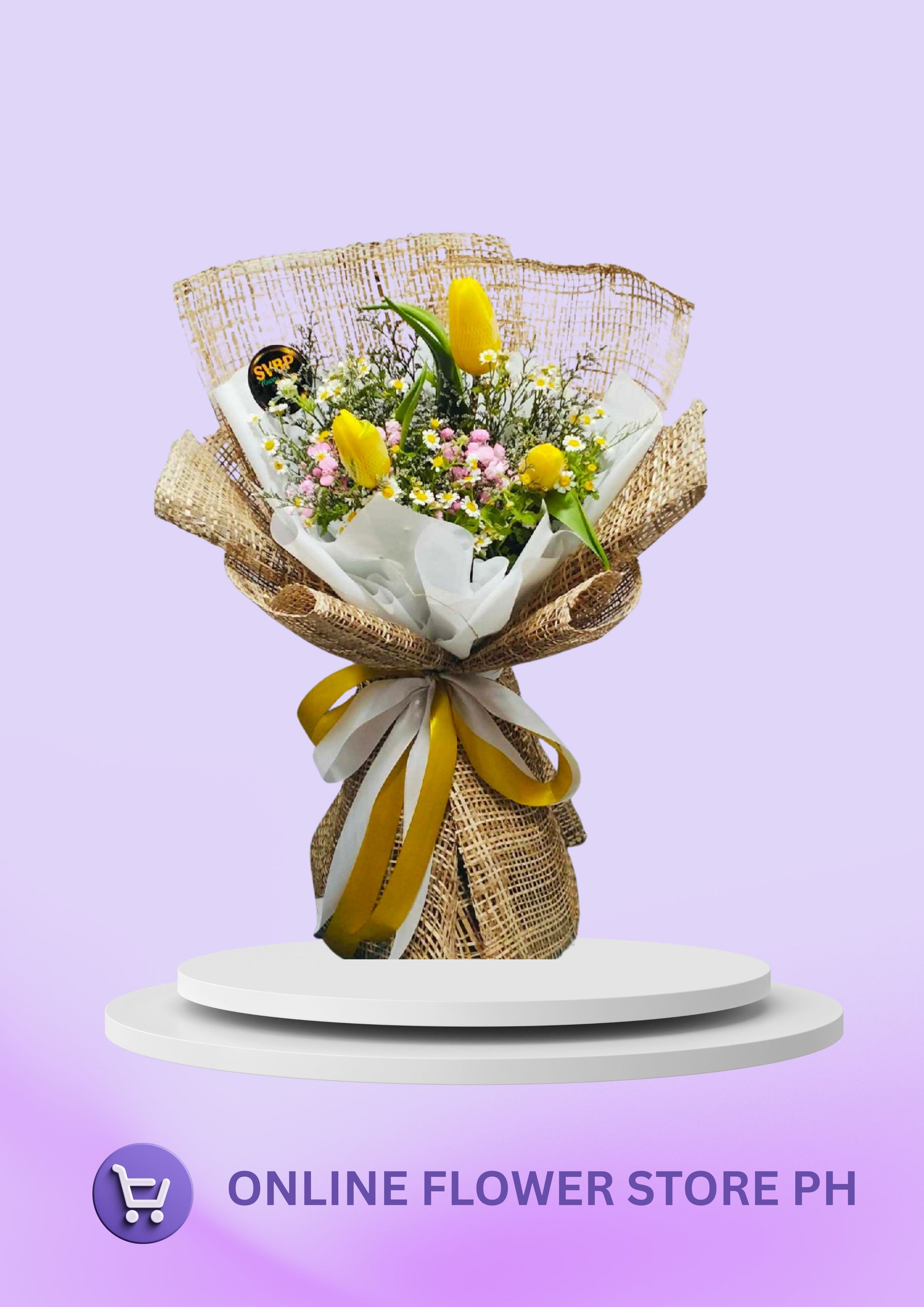 Brighten someone's day with the 3 Tulips of Happiness bouquet, featuring three radiant yellow tulips wrapped in a charming native-style wrapper. This simple yet elegant arrangement conveys warmth and joy, making it a perfect romantic gesture to express affection and brighten any moment.