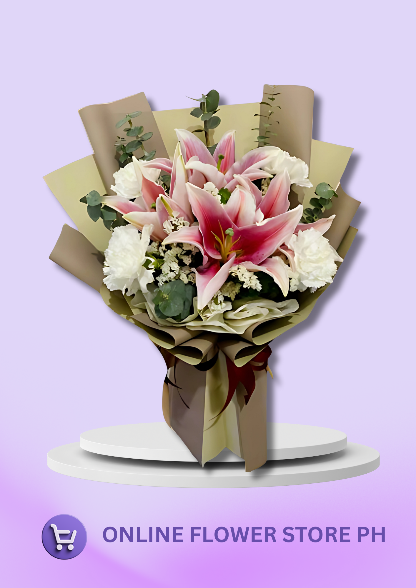 A graceful pairing of pink lilies and white carnations, this bouquet blends the soft romance of lilies with the pure charm of carnations. The pink lilies symbolize prosperity, admiration, and femininity, while the white carnations convey love, innocence, and remembrance.
