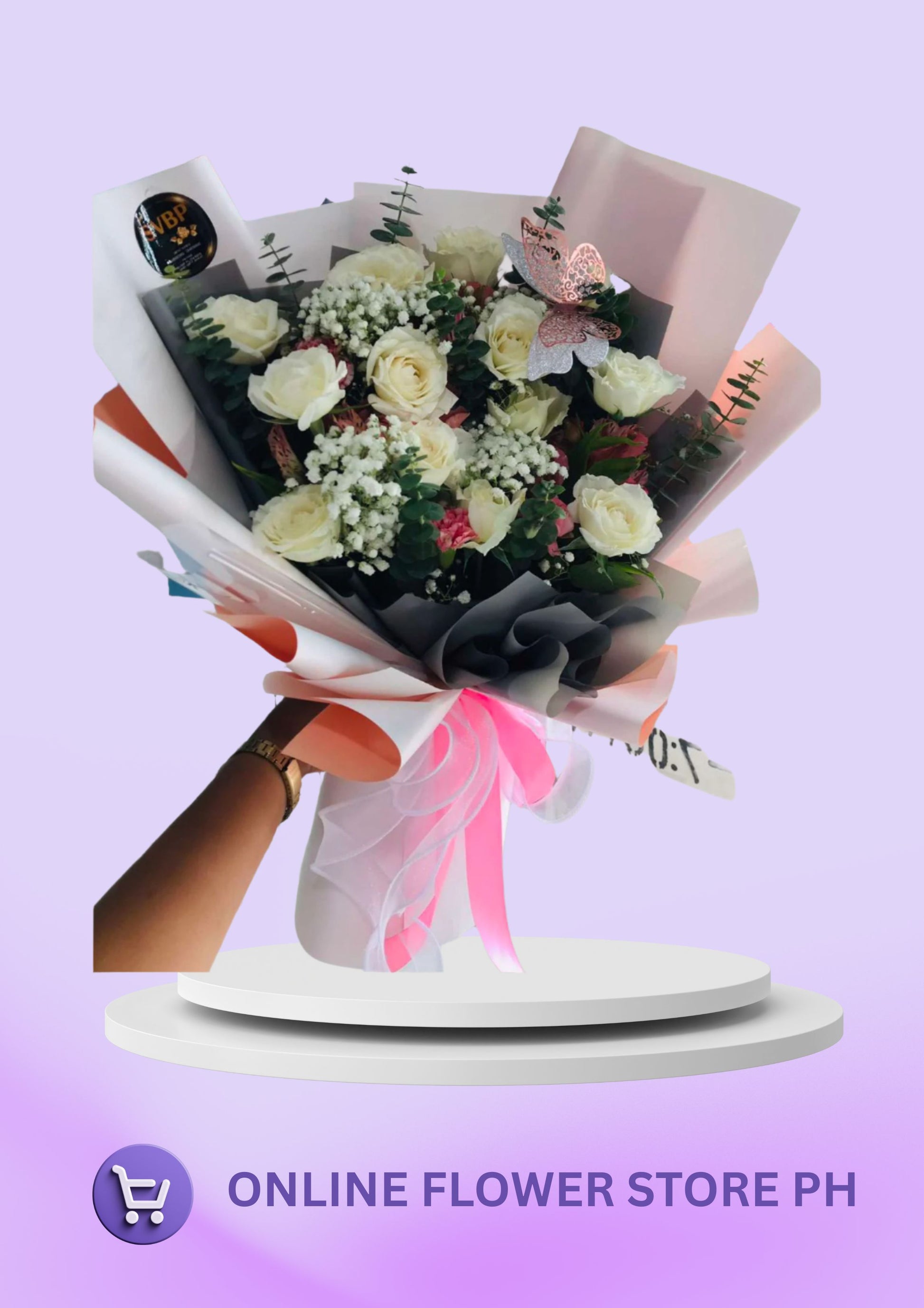 Celebrate love with the "Pure and Loved" bouquet, featuring a dozen elegant white roses complemented by delicate imported fillers. This arrangement embodies purity and affection, perfect for expressing heartfelt emotions on any special occasion. Its timeless beauty makes it an ideal gift to convey your deepest romantic sentiments.