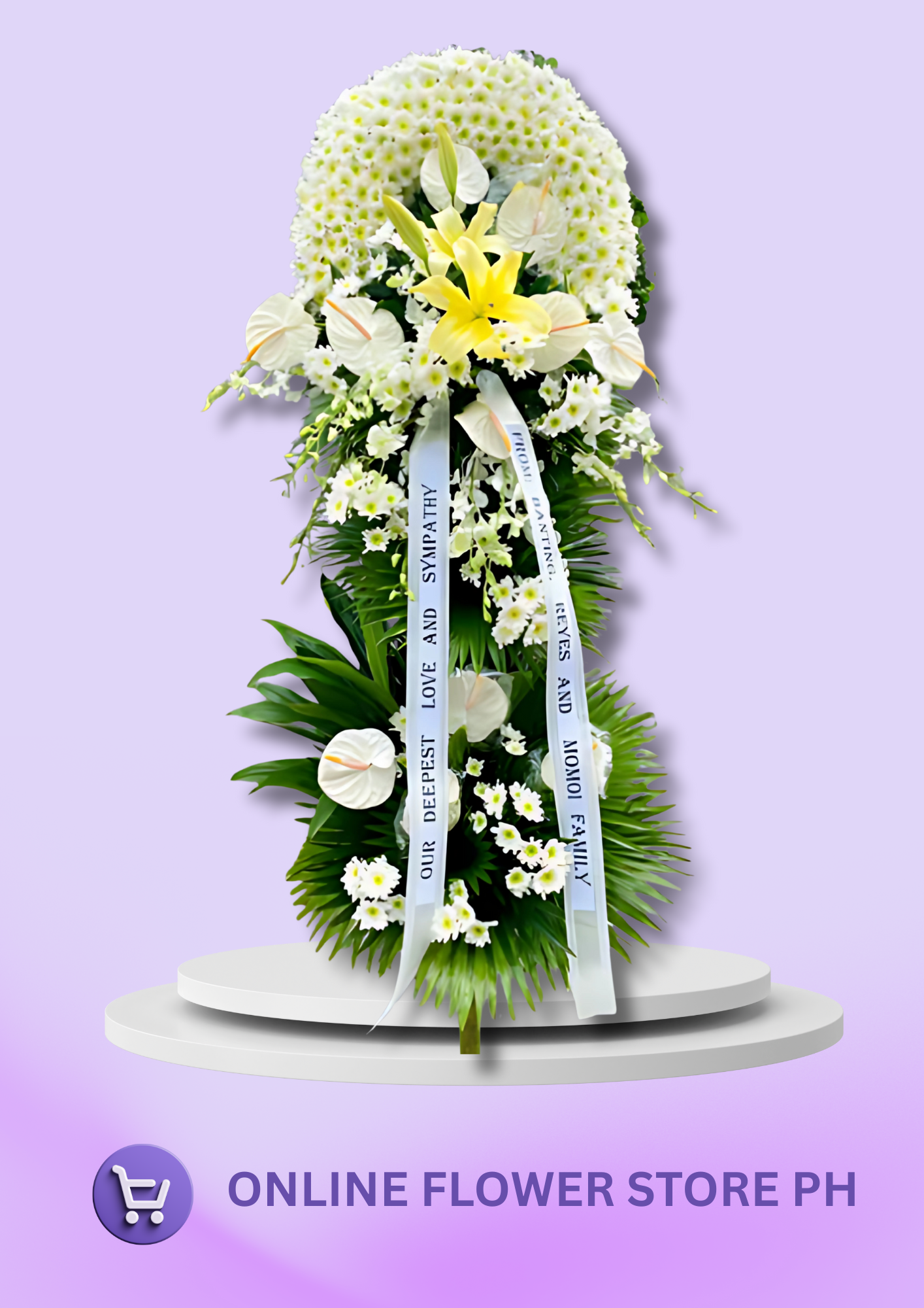 Convey your deepest sympathy with this elegant funeral standee, thoughtfully arranged with white chrysanthemums, ranthuriums, delicate orchids, and graceful lilies. Each bloom symbolizes peace, love, and eternal remembrance—offering a heartfelt tribute to a life beautifully lived.