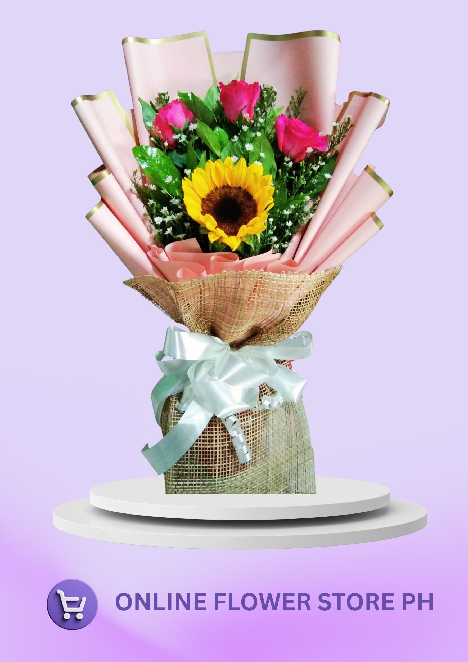 Brighten any occasion with the Sun & Roses Harmony bouquet, featuring a radiant sunflower paired beautifully with three delicate pink rose stems. This vibrant combination brings warmth and elegance, perfect for expressing joy and affection. Ideal for gifting or brightening your space, its fresh blooms bring a harmonious touch of nature’s charm.