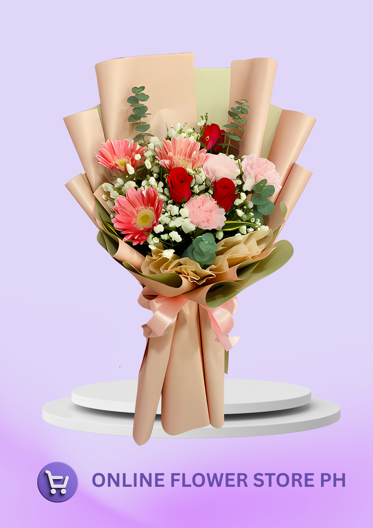 A stunning arrangement combining the classic elegance of red roses with the charm of imported carnations and the vibrant beauty of gerbera blooms. Perfect for expressing love, admiration, and heartfelt emotions on any special occasion.